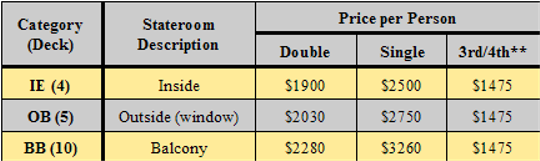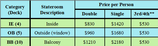 Ottawa Departure - Cruise Staterooms and Pricing*
